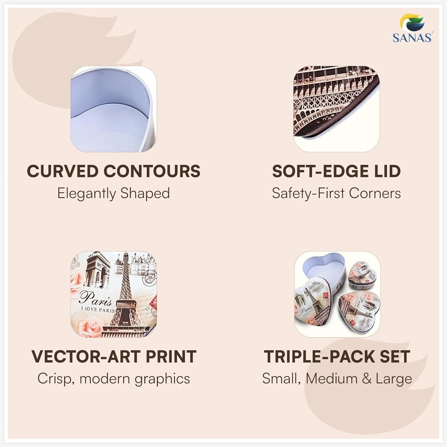 Discover the Sanas Heart Shaped Tin Box Storage set of 3, a perfect blend of elegance and practicality. Featuring a vintage Paris-inspired design with delicate roses and birds, these premium metal boxes are durable and reusable, ideal for long-term storage. The set includes three nesting sizes, perfect for organizing jewelry, chocolates, cosmetics, or keepsakes while saving space. Beyond gifting, these versatile boxes serve as stylish organizers for stationery, accessories, or room decor. Crafted to elevate everyday moments, they make thoughtful gifts for Valentine’s Day, Mother’s Day, weddings, or personal use. Experience timeless charm and functional elegance with Sanas.