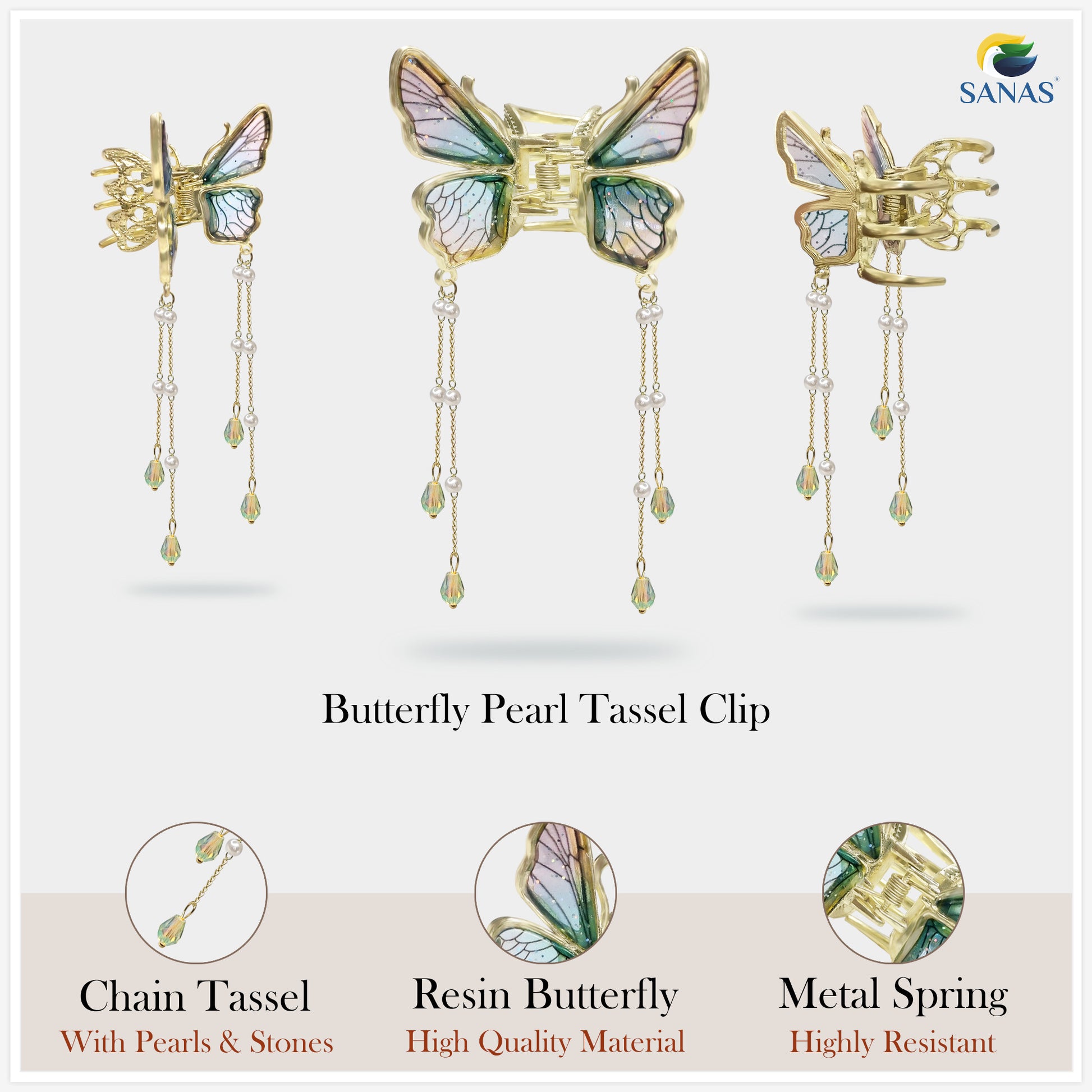 The Sanas Resin Tassel Butterfly Hair Clip is a stunning blend of elegance and whimsy, perfect for adding a touch of charm to any hairstyle. This exquisite hair accessory features a beautifully crafted butterfly made from high-quality resin, showcasing intricate details and vibrant colors that catch the eye. Dangling tassels add a playful and chic element, making it a standout piece in any hair accessory collection. Designed to securely hold hair in place, the clip is both functional and fashionable, suitable for various occasions, from casual outings to special events. The Sanas Resin Tassel Butterfly Hair Clip effortlessly combines beauty and practicality, making it an essential accessory for women who love to express their unique style through their hair.